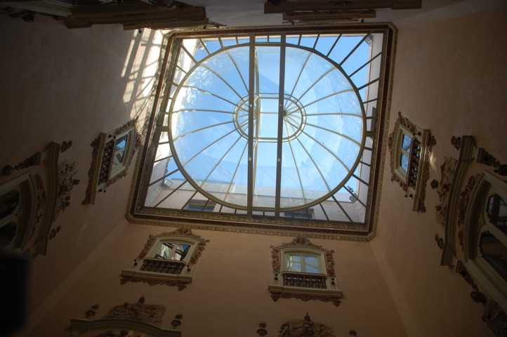 Man betritt das Gebäude und gelangt zuerst in einen Patio, der mit einer Lichtkuppel abgedeckt ist.