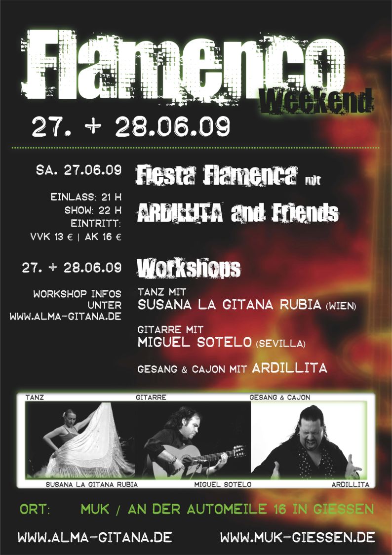 Ein großes Flamenco-Weekend mit unterschiedlichen Künstlern der internationalen Flamencoszene richtet die Flamenco-Gruppe „Alma Gitana“ des Musik und Kunstvereins Gießen e.V. (MuK) am Samstag & Sonntag, den 27 + 28. Juni 2009 ab 13:00 Uhr in den Räumen des Vereins in Gießen, An der Automeile 16, aus.