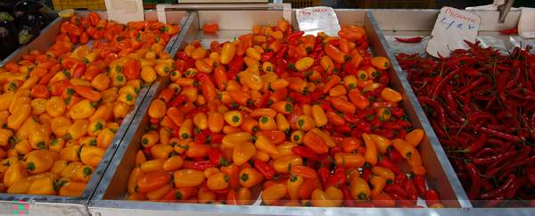 Heute beeindruckten mich vor allen Dingen die kräftigen Orangetöne der Paprikaschoten neben den roten Chilis.