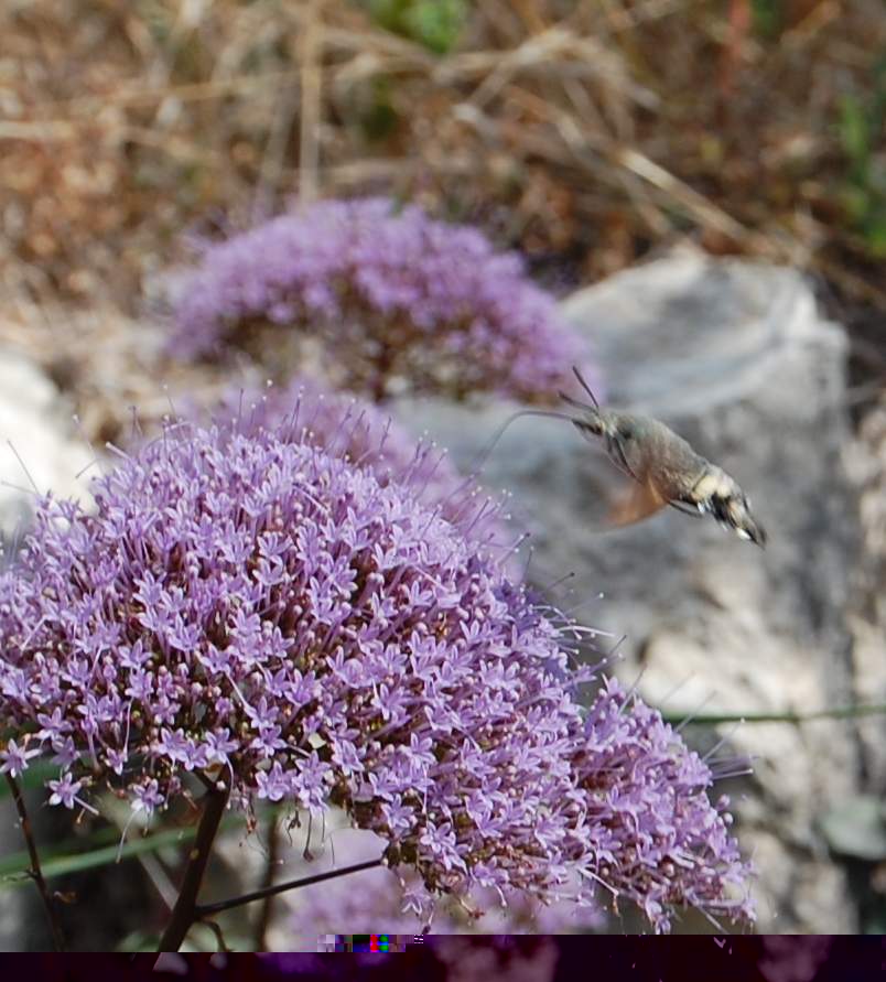 Das Taubenschwänzchen ist ein Wanderfalter, obwohl ich erst an eine Art Hornisse gedacht habe. Wie Kolibri saugt er mit seinem langen Rüssel Nektar aus den Blüten. Die zarten Flügel kann man auf dem Foto kaum erkennen, weil die Bewegungen zu schnell sind.