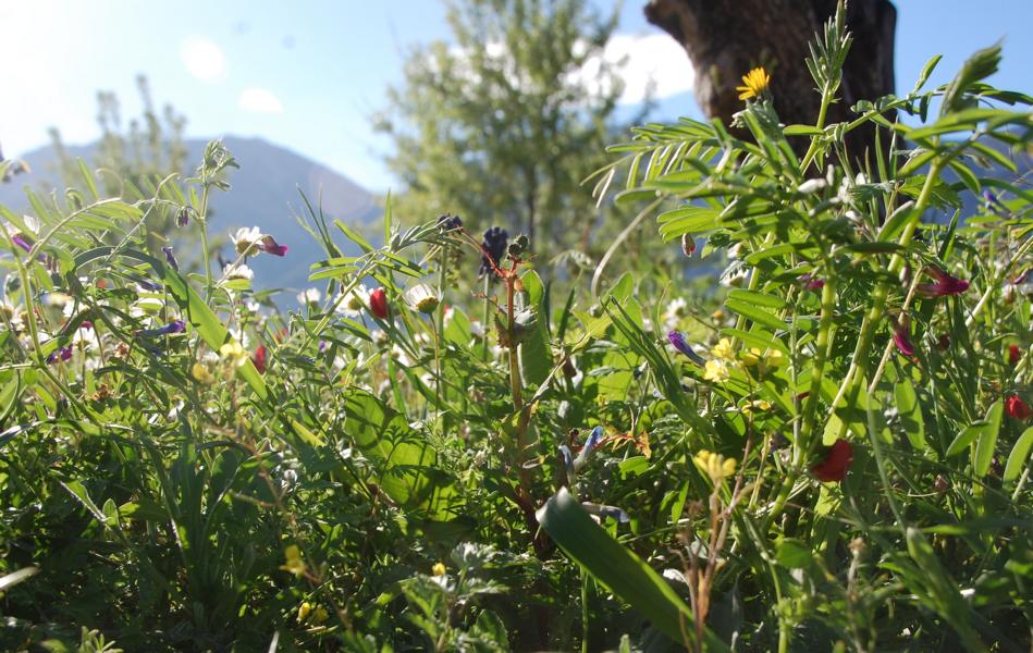Beerensträucher, Weinlaube ( der fängt jetzt auch an zu treiben), Erdbeeren, Birken und Kiefern--