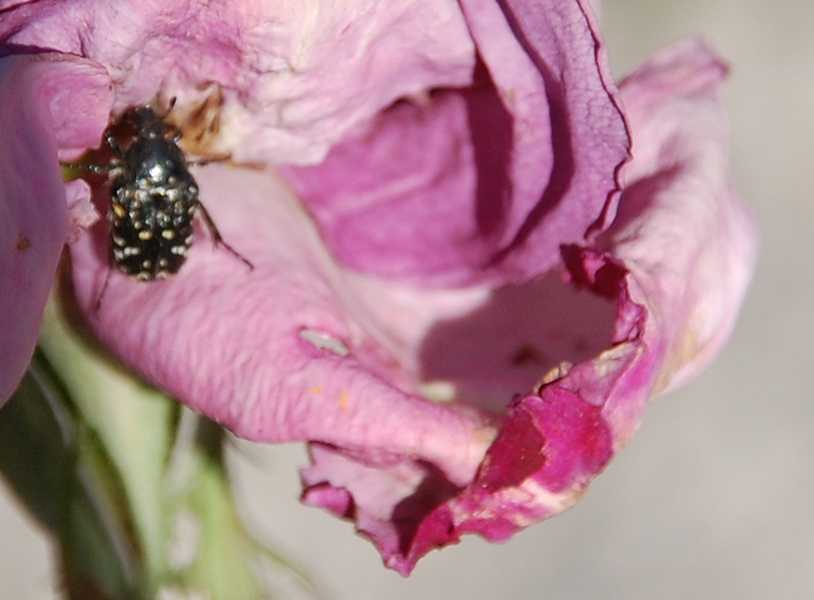 Ich schaute in die erste Blüte und fand einige Käfer. Schnell habe ich beide Blüten abgeschnitten und ausgeklopft. 8 Käfer konnte ich anschließend zählen. Die muss ich mir wohl mit der Rose aus der Gartenhandlung eingeschleppt haben.