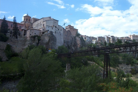 Der Parador befindet sich in dem ehemaligen Dominikanerkloster San Pablo, das 1523 von dem Domherrn Juan del Pozo gegründet wurde. Das Gebäude, ein schönes Beispiel für die Gotik des 16. Jahrhunderts, liegt nicht im Ort, sondern auf einem Vorgebirge gegenüber der Stadt, oberhalb des Húecar, einem der beiden Flüsse, die Cuenca umschließen. Von unserem Zimmer im Parador hatten wir einen fantastischen Blick auf die hängenden Häuser auf der anderen Seite des Flusstales, die Altstadt und die Kathedrale mit anglo-normannischen Einflüssen. Wenn man von einer Flussseite auf die andere gehen wollte, musste man seinen ganzen Mut zusammennehmen, um über über diese hohe Eisenbrücke zu gehen, die die enge Schlucht überspannt. Der Parador mit der barocken Churriguerismus-Fassade seiner Kirche ist einen Besucht wert, seine Aufenthaltsräume, Gänge und Treppen vermitteln noch heute ein wenig Klosteratmosphäre. Das historische Ensemble wurde einschließlich des Kloster San Pablo 1996 zum Weltkulturerbe der UNESCO erklärt-
