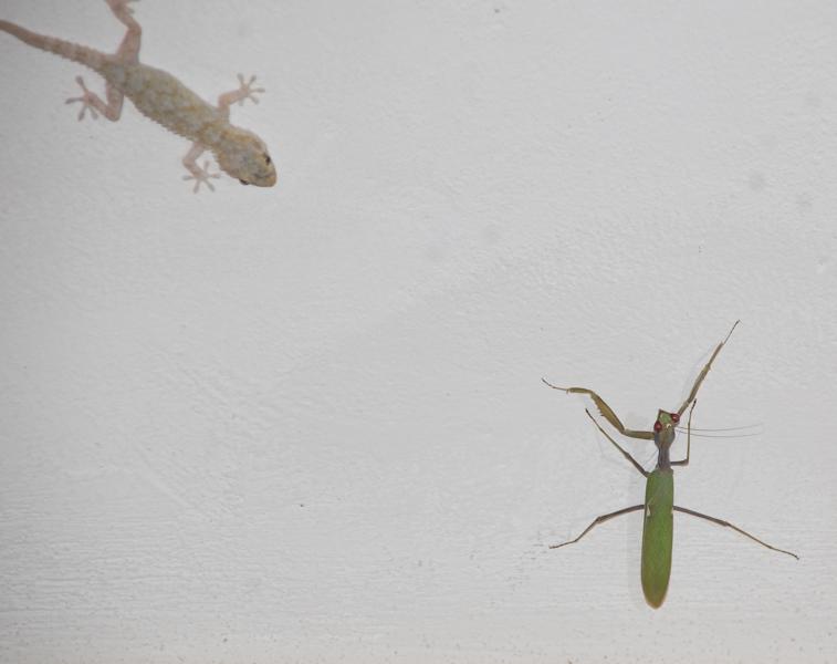 Die beiden umschlichen sich hungrig. Ihre Körper waren annähern gleich groß (Gecko ohne Schwanz = Gottesanbeterin ohne Fühler), ich wartete gespannt, wer zuerst angreifen würde, als plötzlich ein zweiter Gecko um die Ecke kam.
