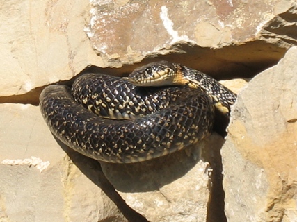 -Hufeisennatter (Coluber hippocrepis), was wahrscheinlicher war. Obwohl diese Schlangenart normalerweise heller und stärker gezeichnet ist, kommt sie auch in dieser sehr dunklen Variante vor.