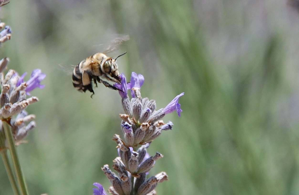 Bei uns summt und brummt es immer noch im Lavendel. Dabei ist mir ein kleiner Flieger aufgefallen, der zwar nicht in Massen auftritt, doch immer wieder zwischen Bienen zu sehen ist. Er ist ziemlich schnell, deshalb auch schwierig zu fotografieren.