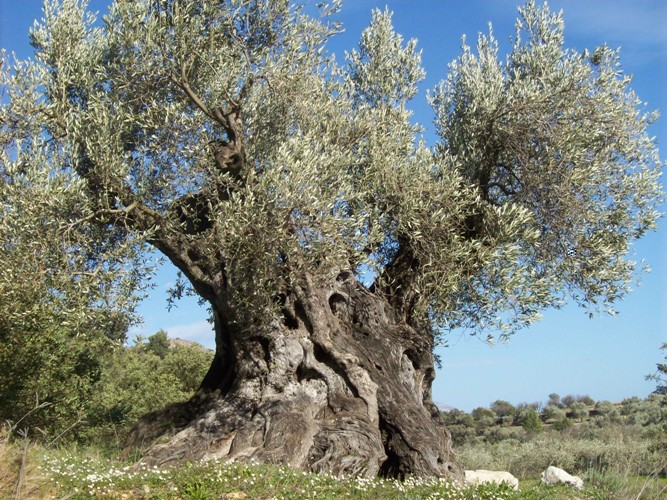er ist sicherlich sehr alt . Bei der Quelle bei uns im Tal standen vor dem Feuer 3 Olivenbäume die waren einige Meter Hoch ( Stamm ca 6m) und hatten einen Durchmesser von mehr als 1,50 cm . Aber die hatten ihre Füsse im Wasser . Bei Ausreichend Wasser wachsen Olivenbäume schneller . Sicherlich gehört er zu einen der ältesten im Land Valencia . Die Olivenbäume kamen mit den Griechen nach Spanien. Sie können deshalb so alt werden da sie sich ständig von außen erneuern . Der Kern verfault , daher ist eine exakte Altersbestimmung fast unmöglich . Also kann jeder behaupten was er will . Aber ich würde die Messlatte nicht so hoch anlegen .