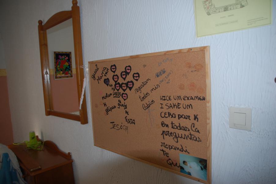 Über eine Außentreppe des Neubaus gelangen wir in die ersten Etage, wo sich Zimmer an Zimmer reiht. Hier sind die Jungen in Doppelzimmern untergebracht. Alle Räume sind klein und zweckmäßig, jeweils mit zwei Betten, Schränken, Tischchen und Stühlen eingerichtet. Neben diesen Doppelzimmern gibt es auch Mehrbettzimmer, in denen Geschwisterkinder untergebracht sind, sie werden nicht auseinander gerissen. Montse erzählt uns von einem deutschen Paar, das auf der Straße lebt und deren fünf Kinder in der Einrichtung untergebracht sind bzw. waren... Doch dazu später noch einmal.