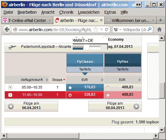 Beispiel: 7.4.- 5.6.=355,86 €/Person Hin- und Rückflug... (213,03 Euro hin und 142,83 zurück - FlyClassic)