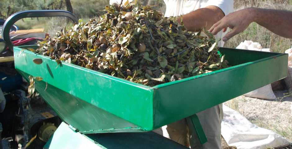 Die geernteten Mandeln werden in den Trichter der Schälmaschine geworfen.