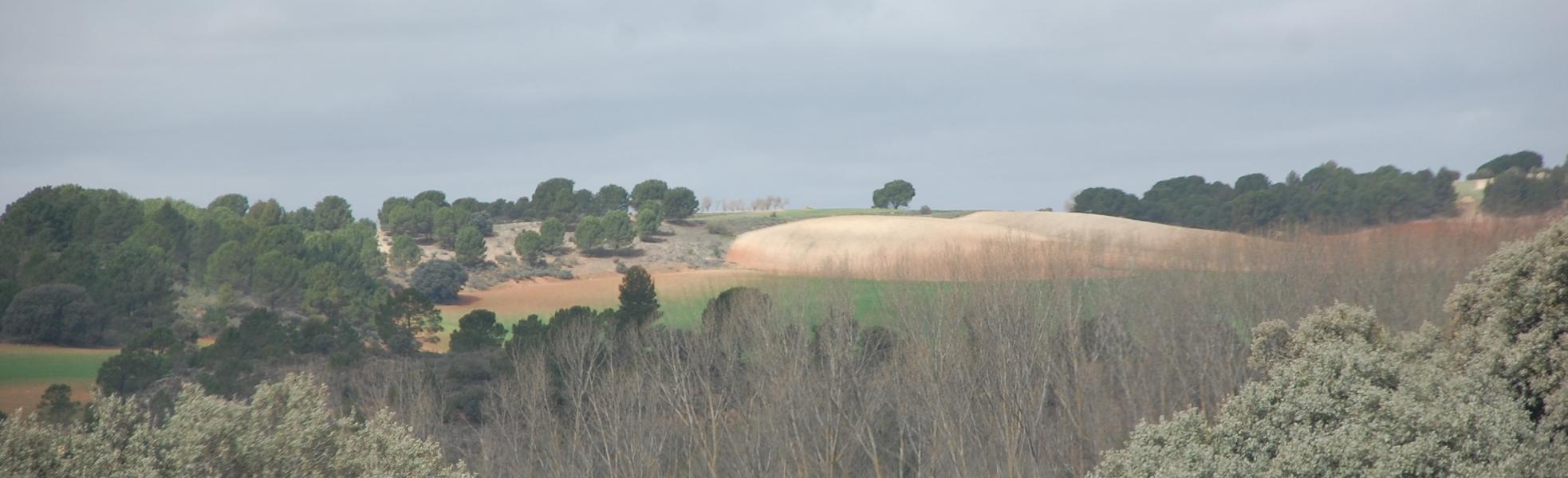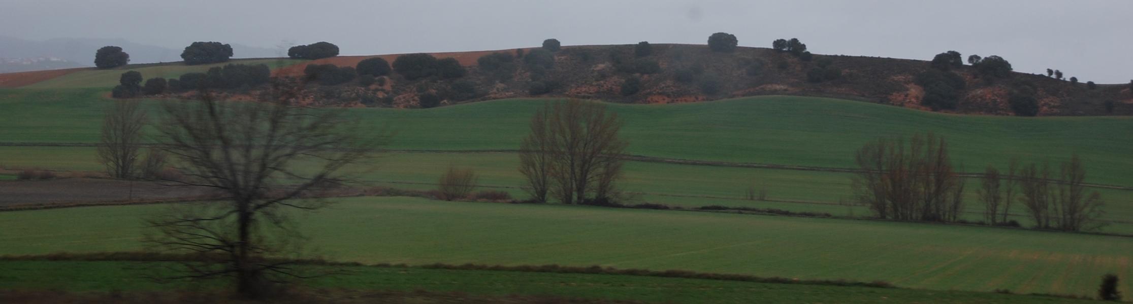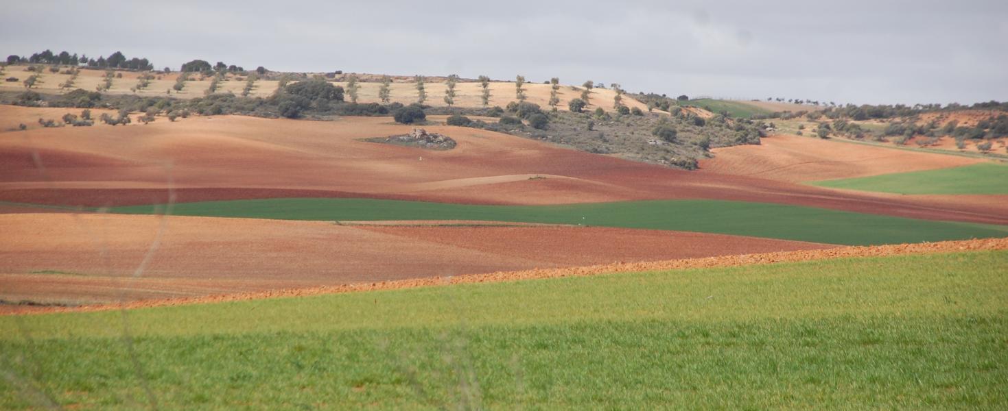 ,Die dunkelgrünen Pinien-, die Steineichenwälder, die solitären Bäume auf den Äckern, silbriggrüne Olivenbäume, die noch blattlose, graue Baumgerippe der Pappeln, das braune Holz der Weinstöcke; La Mancha ist das größtes Weinbaugebiet Spaniens. Die Weinberge sind im Muster angelegt, das man marco real oder cuadrado nennt