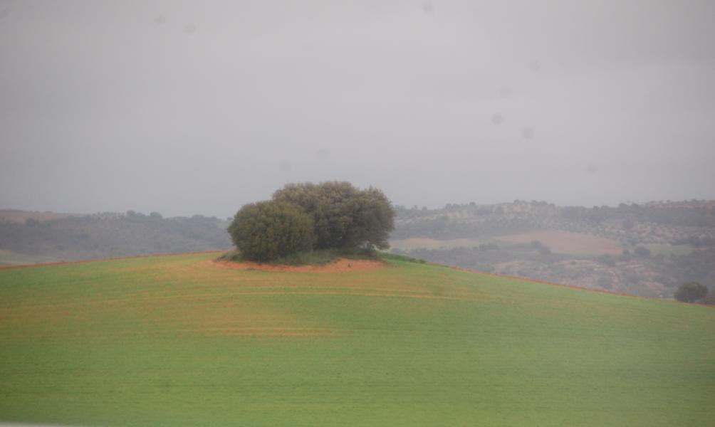,Die dunkelgrünen Pinien-, die Steineichenwälder, die solitären Bäume auf den Äckern, silbriggrüne Olivenbäume, die noch blattlose, graue Baumgerippe der Pappeln, das braune Holz der Weinstöcke; La Mancha ist das größtes Weinbaugebiet Spaniens. Die Weinberge sind im Muster angelegt, das man marco real oder cuadrado nennt