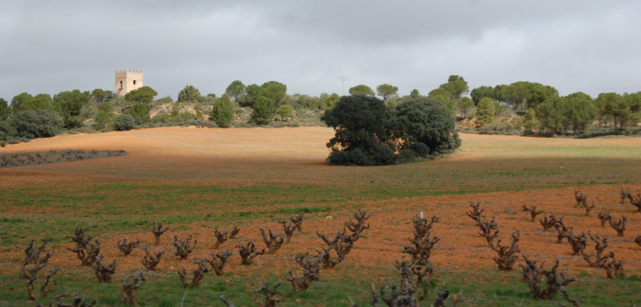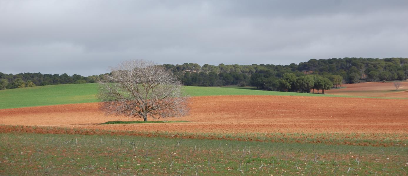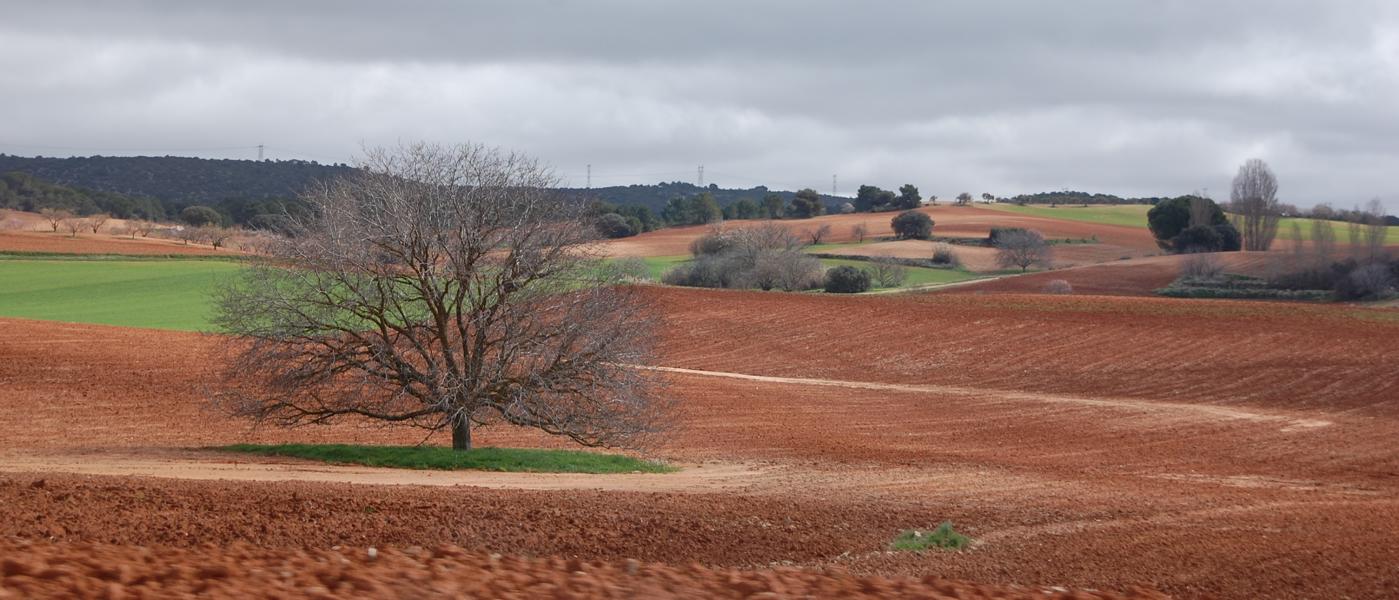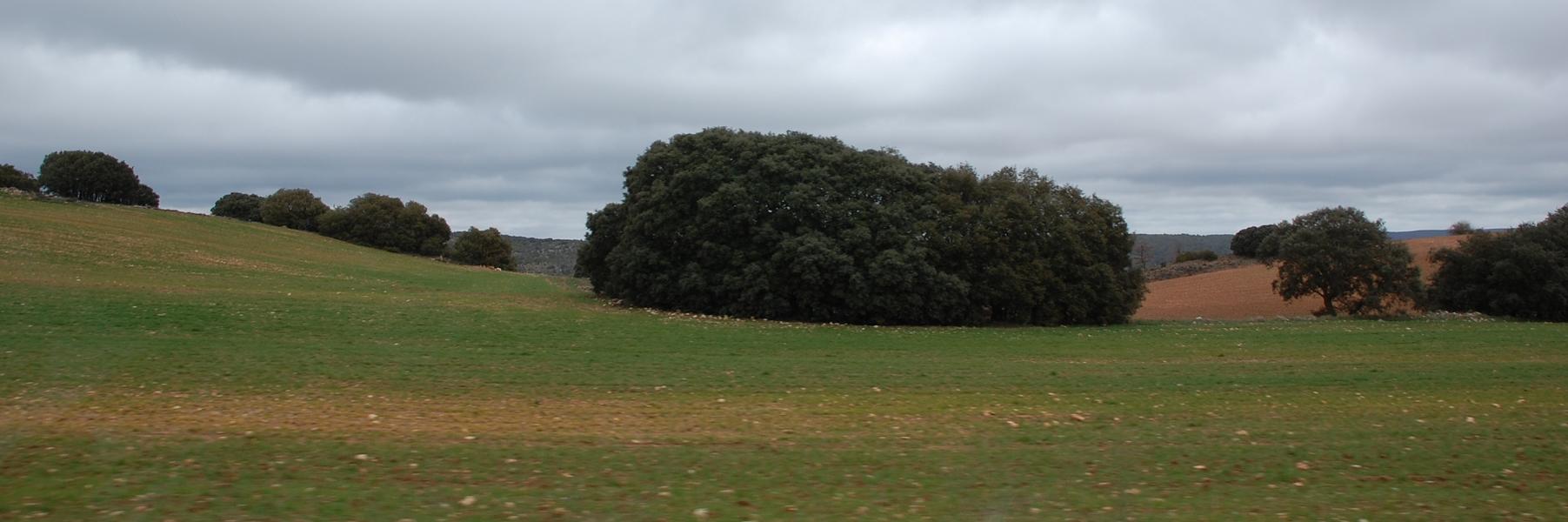 ,Die dunkelgrünen Pinien-, die Steineichenwälder, die solitären Bäume auf den Äckern, silbriggrüne Olivenbäume, die noch blattlose, graue Baumgerippe der Pappeln, das braune Holz der Weinstöcke; La Mancha ist das größtes Weinbaugebiet Spaniens. Die Weinberge sind im Muster angelegt, das man marco real oder cuadrado nennt