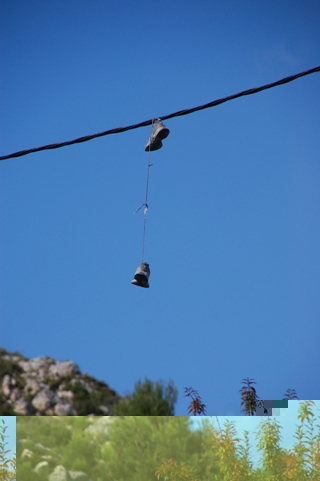 Hier ist eine andere Variante zur Schuhentsorgung. Diese Schuhe habe ich bei einem Standspaziergang an den Dünen gefunden. Sie mussten dort schon länger gestanden haben, denn die Ösen hatten schon Rost angesetzt.