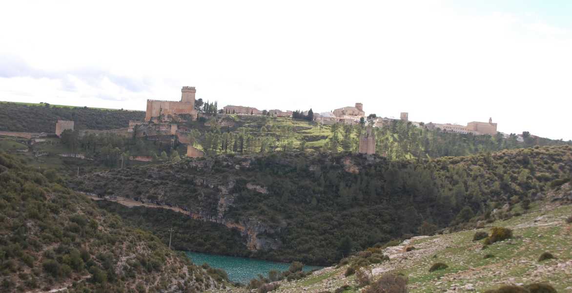 Einige Zeit, nachdem wir von der N-III auf die schmale Nebenstrecke CUV 8033 abgebogen waren, sahen wir die eindrucksvolle Burganlage auf der rechten Seite. Wir fuhren in einen Feldweg, von dem man den Río Júcar,mit der Burg. "Insel", die man nur über eine schmale Zufahrt erreichen kann, in der Flussschleife (hoz) liegen sehen kann. Unterhalb des Burgberges befindet sich die Emblase de Alarcón, eine Talsperre des Júcar. Wir hatten Glück und die Sonne schien einen Moment lang, um ein Foto zu machen.