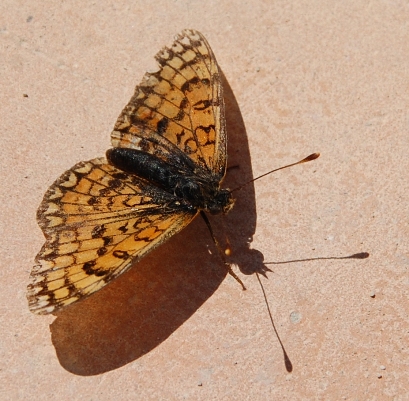 Dafür konnte ich den Scheckenfalter von allen Seiten fotografieren, da er in den Pool gefallen ist und sich nach seiner Rettung erst einmal erholen musste.