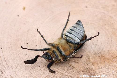Ich bin ca. 4 cm lang und unter meinem Panzer sitzen relativ große, kupferfarbene Flügel.