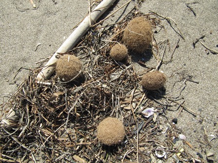Ich glaube auch, dass die Bällchen unter Wasser entstehen und am Sandstrand (jedoch unter Wasser) die einzelnen Halme durch die Bewegung der Wellen zu Kugeln geformt werden.
