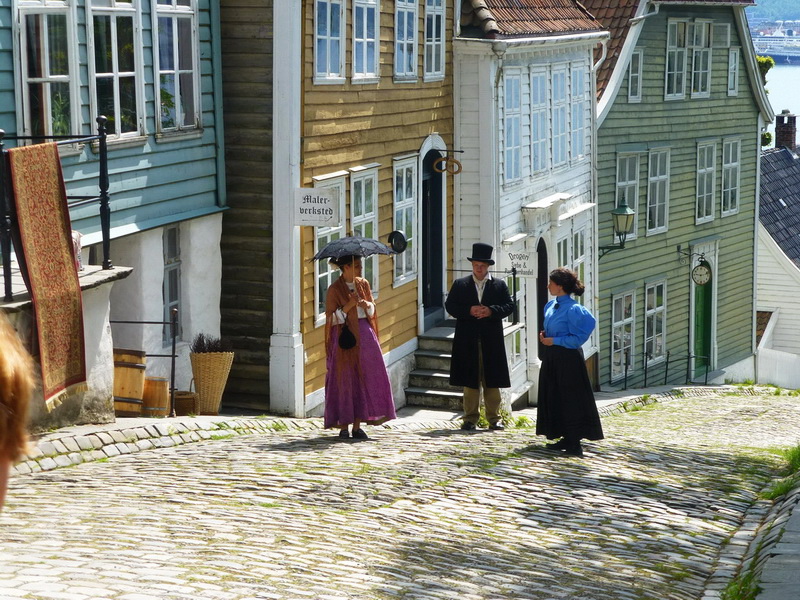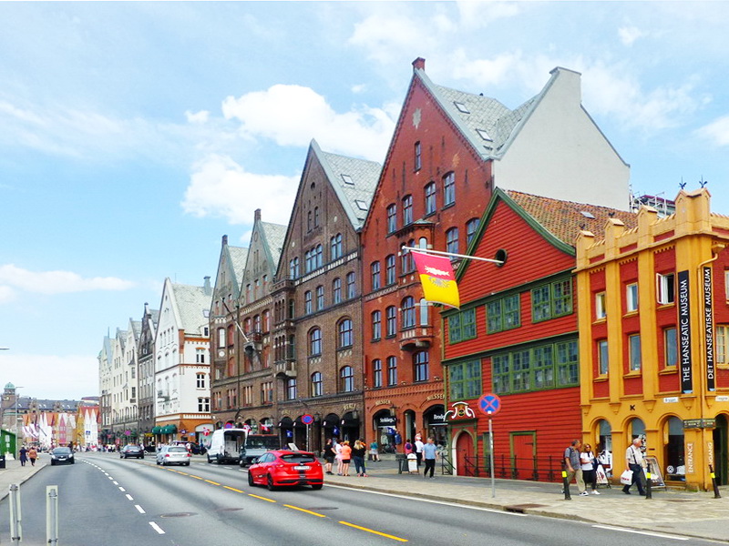 Nach wie vor zeigt sich das Wetter von seiner besten Seite. Da lässt sich so eine Stadt gut erkunden. Im Viertel Bryggen stehen zahlreiche Handelshäuser an der alten Landungsbrücke, nach ca. 1350 Stützpunkt der Hanse und heute Weltkulturerbe. Die hölzernen Gebäude brannten im Verlauf der Jahrhunderte mehrmals ab und wurden dann wieder aufgebaut.