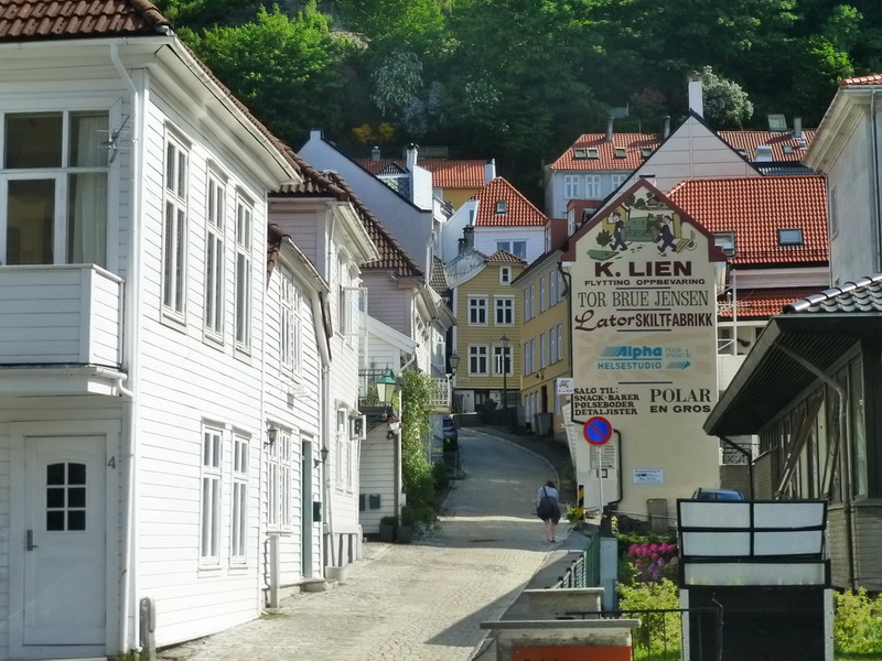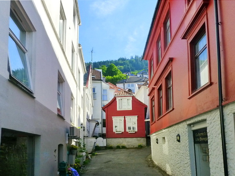 Zum Hausberg Fløyen hin ziehen sich die Gassen teils steil den Hang hinauf.