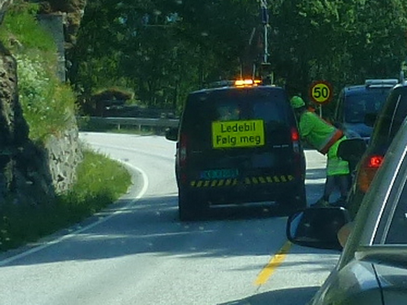 Wieder beim Wagen, steuern wir die Höhenstraße Sognefjellswegen an. Bei norwegischen Straßenbauarbeiten gibt es schon mal Wartezeiten. Dann kommt i.d.R. irgendwann ein Baustellen - “Leitfahrzeug”, wendet wieder, und schließlich folgt ihm die Autoschlange brav bis zum Ende der Baustelle!