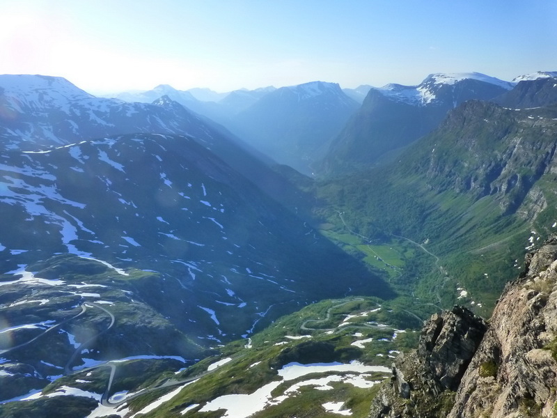 Bei Fossbergom biegen wir nach Nordwesten ab in Richtung Geiranger. Es ist bereits Abend, als wir kurz vor Erreichen des Fjords auf eine Mautstraße hinauf zum Dalsnibba abbiegen. Nach kurzer steiler Fahrt erreichen wir diesen spektakulären Aussichtspunkt, ca. 1500 m hoch über dem Geiranger Fjord gelegen.