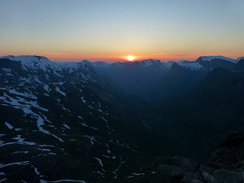 Eigentlich hatten wir vor, hier zu übernachten, aber gegen 23 Uhr ist es schon empfindlich kalt geworden. Die Sonne geht jetzt unter, als kurz vor Mitternacht wir beschließen, bis in die Nähe des Geiranger hinunter zu fahren, wo es jedenfalls ein paar Grad wärmer sein wird. Auf einem Parkplatz abseits der Straße finden wir dann “unser” Plätzchen.
