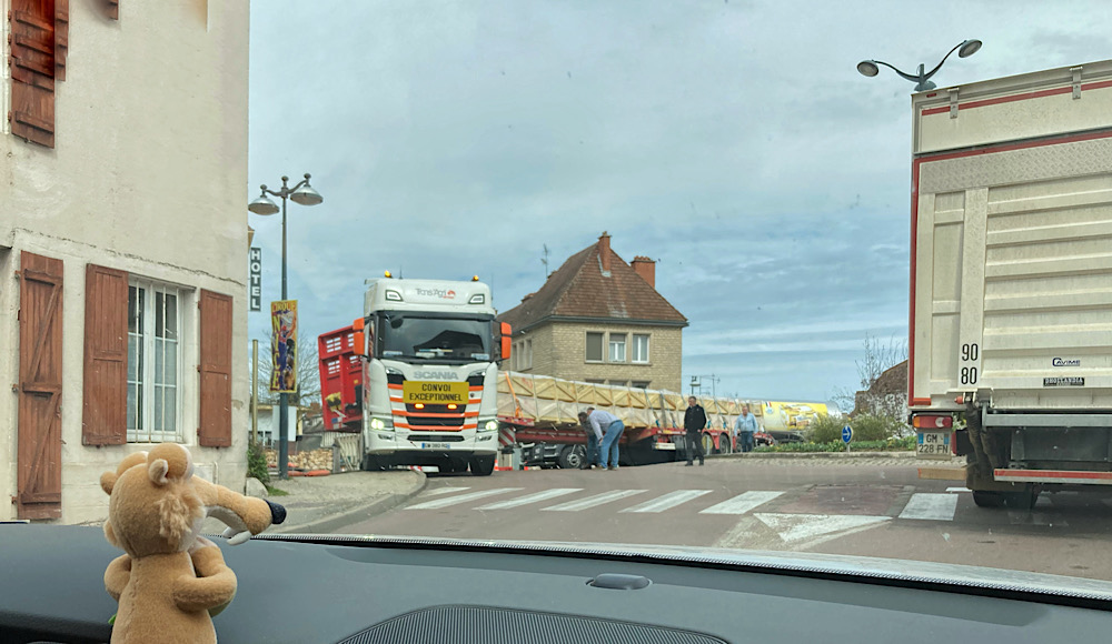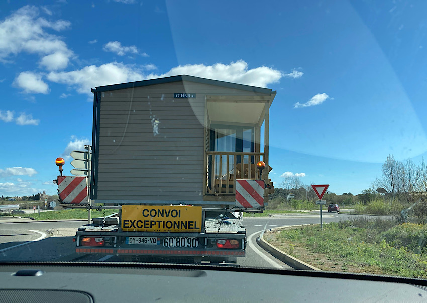 Mal wieder ging es durch kleine Ortschaften und heute auch mit einigen interessanten Sondertransporten (transport exceptionel). In Coursan hatten wir die Ehre, hinter einem rollenden Haus herfahren zu dürfen. Was für uns Kurzweil auf der Strecke war, machte jedoch so manchen Terminabhängigen reichlich nervös. Da in Frankreich die Geschwindigkeit auf Landstraßen auf 80 km/h begrenzt ist, hatten wir keine Probleme, der jungen, routinierten Fahrerin des Tanklasters zu folgen, Heute hatten wir eine längere Strecke über die A75; auch hier hielt sich die Verkehrsdichte sehr in Grenzen.
