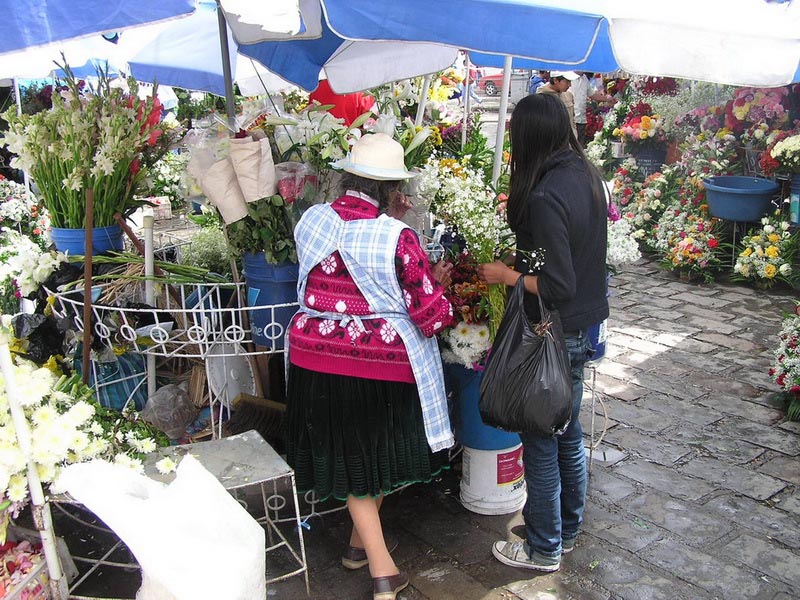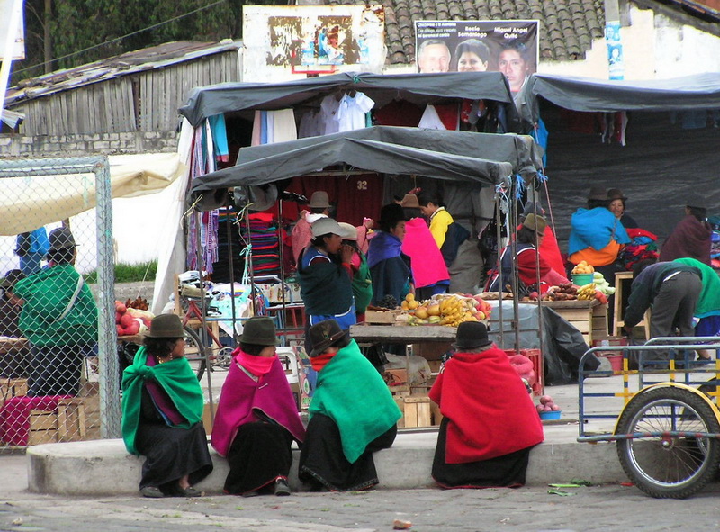 Natürlich ist es besonders interessant, die Leute zu beobachten und auch zu fotografieren. Die meisten der kleingewachsenen Ecuadoner/innen sind deutlich indigener Herkunft und traditionell gekleidet. Die Hüte sind zwar nicht ganz so malerisch wie die ihrer peruanischen Nachbarn, aber fast niemand geht ohne Kopfbedeckung gegen die Kühle oder die zu erwartende Sonne auf die Straße. Viele Frauen, aber auch Männer haben sich in Ponchos oder Decken gehüllt.
