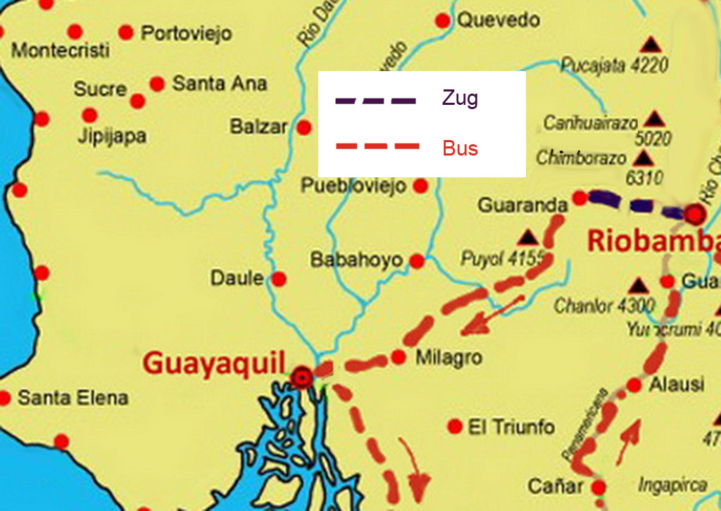 Wir sind inzwischen also in Riobamba angekommen. Es ist eine Stadt mit über hunderttausend Einwohnern, in der wir im sehr netten Hotel „El Libertador“ ein Zimmer beziehen. Gegenüber liegt der Bahnhof, von dem drei Mal wöchentlich ein legendärer Zug auf holprigen Gleisen eine der weltweit wohl schwierigsten Trassen überwindet. Mit ihm wollen wir später auch fahren !