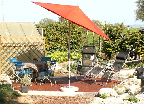 Das ist unser Sitzplatz. Der Boden ist aus afrikanischen Balkondielen aus kontrolliertem Anbau gefertigt. Mindestens zwanzig Jahre Haltbarkeit und dann kratzt mich das nicht mehr, wahrscheinlich!!! Eingerahmt aus Granitschweinetrögen. Normalliegend oder als Treppenstein umgekehrt. Die Bepflanzung der Tröge ist aus Dachwurzgewächsen (Sempervivum) verschiedenster Sorten und Fetthenne (Sedum) gewählt. Muss nie getränkt werden und würde sich in Spanien wahrscheinlich auch bewähren.