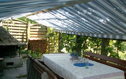 Blick von vorne in die Pergola. Das Dach aus Stoff, wie er beim Storenbau oder Massivvorzeltbau (Camping) verwendet wird, habe ich nach meinen Angaben zuschneiden und nähen lassen.