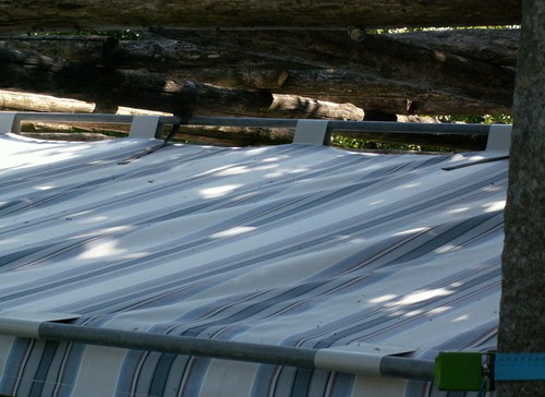 Wie versprochen habe ich heute nach den Regenschauern (die auch bei uns nötig sind) das provisorisch gespannte Sonnendach in der Pergola geknipst. Vor drei Jahren kam ich auf die Idee die Pergola inwendig mit einem Dach zu versehen. Grund war damals, dass regelmässig, wenn wir drausssen am Abendessen oder hocken waren Regen einsetzte und uns vertrieb. Damals verwendete ich versuchsweise mal Plastik. Da sich das Überdachen bewährt hatte, sollte nun jetzt eine schönere Variante unsere Draussensitzfreuden verschönern.