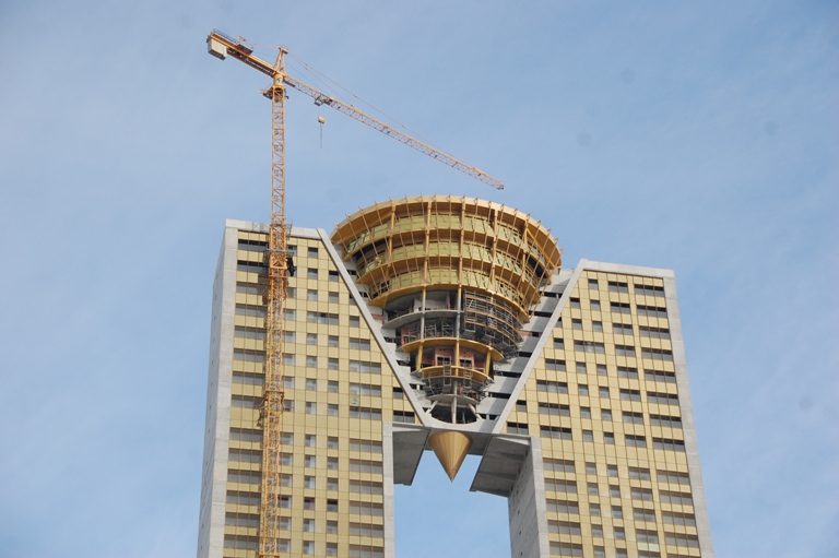 Obwohl, dieser Klotz hat schon etwas Gewaltiges, das "höchste Hochhaus" mit seinen 200 Metern. Noch immer wird daran geschraubt und gewerkelt, überall Baulärm, es wird gebohrt und gehämmert, was das Zeug hält. Der "Rohdiamant" , der bedrohlich in der Mitte hängt, muss wohl noch geschliffen werden, er ist teilweise immer noch im Rohbau.