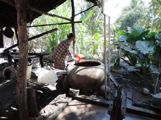 Der aufgeweichte Reis wird mit Einsatz des gesamten<br />Körpergewichts durch eine Form gepresst, aus der die <br />Reisnudeln herauskommen