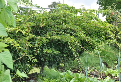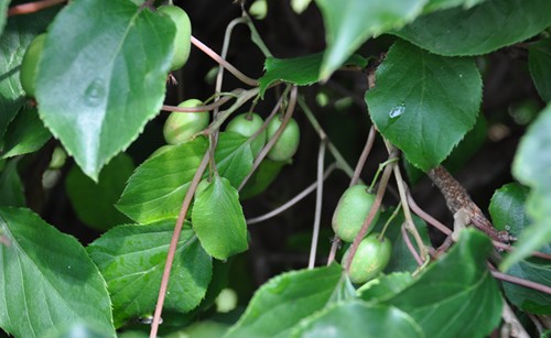 Kleinfrüchtige Sorte Actinidia arguta. Hecke mit zwei weiblichen und einer männlicher Pflanze. Mitte und unten die zwei Sorten die ich habe.