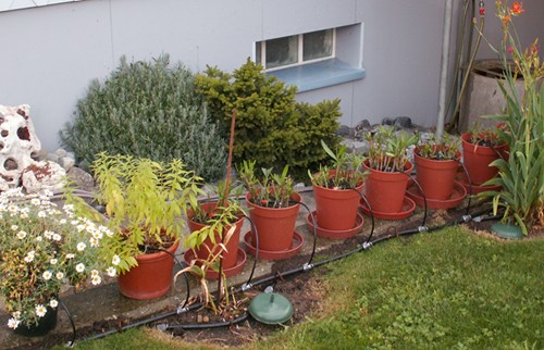 Am selben Schlauch habe ich mit einem T-Stück und einer Wasserstopkupplung, dies an drei Stellen vom Garten, montiert. Dort schliesse ich dann auch das Schlauchstück mit den diversen Abgängen zu den Tropfern (Micro Dripssystem der gleichen Firma )an die direkt zu den Töpfen geht. Alle grossen Schläuche und somit auch die Tropfer (ich verwende die einstellbaren) sind einem Bewässerungscomputer angeschlossen. Den Computer kann man die Bewässerungszeiten und Längen beliebig programmieren. Um noch mehr Wasser zu sparen, geschieht das bei mir früh am Morgen und am Abend. Als Ergänzung gibt es noch einen Bodenfeuchtigkeitssensor und ein Regensensor. So kann noch effektiver auf Wassersparen gehalten weden, denn bei genügend Feuchte und Regen muss ja nicht noch bewässert werden. Habe beide Geräte, jedoch der alten ersten Generation, die mich jedenfalls nicht befriedigte.