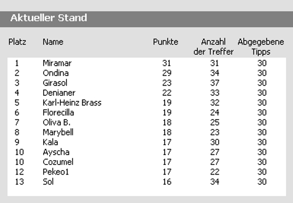 Wieso nur einen Punkt, ich habe doch das Ergebnis exakt richtig getippt?Florecilla hat geschrieben:[Girsols schlechtes Gefühl hat sich bewahrheitet und ihr, Kala, Karl-Heinz und sol je einen Punkt beschert.