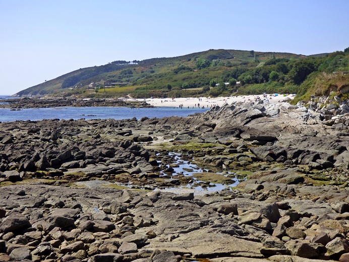 Wir kommen nach Sanxenxo, dem "Marbella Galiciens". Viele Hotels und Appartement-Anlagen, Jachthafen mit Segelschule, Restaurants, Diskotheken und viel Rummel. Wir halten nicht an, fahren weiter an dem 7km langen Sandstrand A Lanzada vorbei,