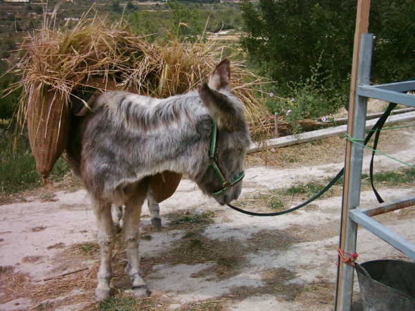 Was fressen deine Esel, wie hoch sind deine monatlichen Futterkosten und kommen dazu noch Tierarztkosten? Von Freunden, die selbst vier Esel (Fotos) haben weiß ich, dass diese Tiere sehr genügsam sind. Sie fressen gerne die wilden Triebe der Oliven, die sich um den Stamm herum bilden. Diese Triebe wachsen ständig nach, also eine nie versiegende Futterquelle. Leider leben wir zu weit von dir entfernt, ich könnte dir sonst Mengen davon vorbei bringen. Bei dir in der Gegend gibt es genügend Ländereien mit Olivenbäumen. Wenn du da einen Bauern hättest, wo du dir jeden Morgen einen Schwung abschneiden könntest (ich schneide in einer Stunde einen Riesenberg), dann hättest du schon mal Futter für den Tag. Damit wäre dem Bauern geholfen, der seine Oliven unten immer sauber hätte und auch dir. Ich würde mich freuen, wenn mir jemand diese Arbeit abnehmen würde! Eine andere Futterquelle sind die Algarrobos (Karoben- oder Johannisbrotbäume) im Sommer. In wie vielen Gärten der Urbanisationen stehen diese Bäume und die Besitzer wissen nicht, wohin mit ihren Früchten? Wir sammeln jedes Jahr im August bestimmt 3 große Säcke und haben nur einen Baum. Die Algarrobas bringen wir zu unseren Freunden mit den Eseln, die sie nach und nach an sie verfüttern. Das Johannisbrot lässt sich lange lagern, sofern es trocken steht.
