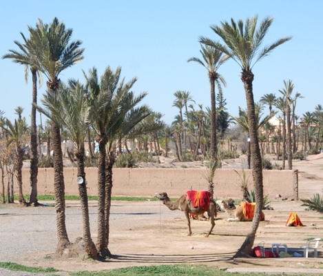 [Die Palmen werden bewässert, die Gegend wirkt jedoch teilweise ziemlich ungepflegt, überall liegen Schutthaufen herum, dazwischen warten Gruppen von Dromedaren auf Touristen, um sie durch die Wüstenlandschaft zu tragen.
