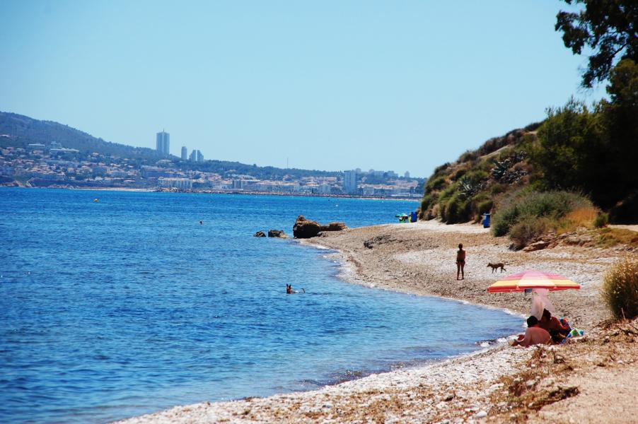 Es handelt sich um einen Steinstrand mit kleinen runden Kieseln, von dem man auf einem Klappstuhl dösend wunderbar aufs Meer und auf das Inselchen "La Illeta" schauen kann, wer möchte sogar im überraschend kühlen Schatten unter den Pinien. Ehrlich gesagt, wenn ich Hund wäre, würde ich mich dort sehr wohl fühlen - und Frauchen und Herrchen ganz sicher auch. Man kann den ganzen Tag dort mit Stöckchen oder Steinchen fangen verbringen, und wenn der Mensch kein Picknick mitgebracht hat, ist für den großen Durst, den kleinen Hunger und die Not zwischendurch ein Chiringuito mit Toiletten zu Fuß erreichbar - entweder am Meer entlang oder etwas oberhalb des Strandes über den Küstenwanderpfad. Apropos Küstenwanderpfad: lohnenswert, den werde ich noch an anderer Stelle beschreiben.