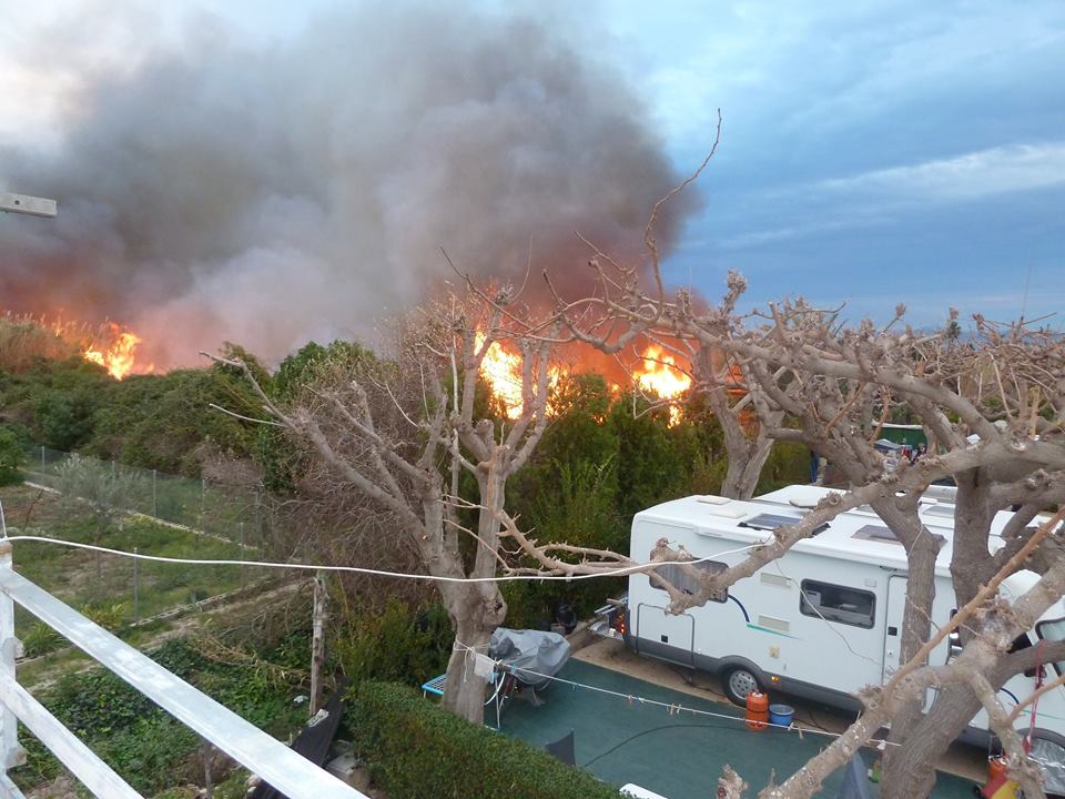 Das Feuer war nur noch ca. 10 Meter von den fahrzeugen und Zelten entfernt. Mit Mühe ist es und gelungen mit Gartenschläuchen solange Wasser auf das feuer zu spritzen und damit den vormarsch zu verlangsamen, bis die Feuerwehr aus Gandia eintraf.