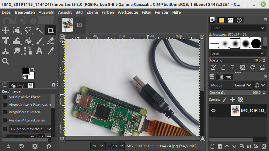Bildgröße bei Fotos ist so ein Thema. Leider aus Bequemlichkeit häufig völlig überdimensioniert. Mit dem PC empfehle ich die Software "gimp". Die gibt es für alle gängigen Betriebssysteme für 0,-- € (plus 21% Ust natürlich, Versand ist kostenfrei unter https://gimp.org). Nehmen wir beispielsweise ein ganz normales Foto von einem Billig-Smartphone (Wiko Lenny 4, 70 € Klasse von vor ein paar Jahren). So ein Foto hat dann hochkant 3264 x 2448 Bildpunkte, genug für ein Werbeplakat aber viel zu viel für ein Forum. Und hier der Grundkurs. Wenn die Gimp-Software installiert und gestartet ist, dann