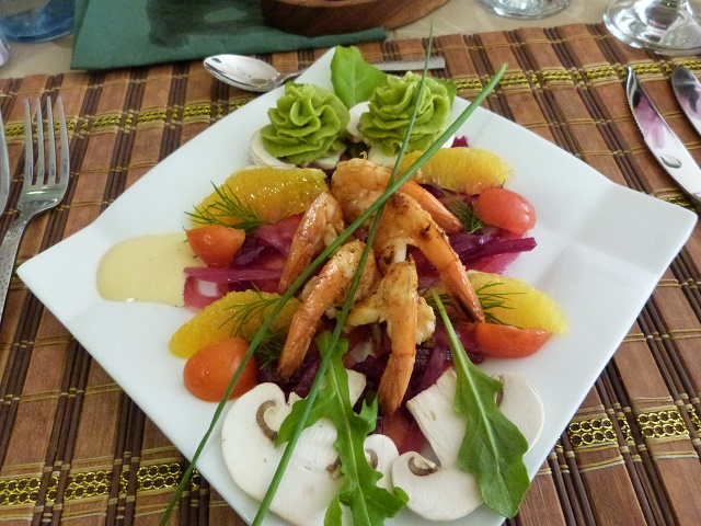 kleiner Salat mit gebratenen Scampi Filet vom Schwein Waffeln mit Eis und Beeren
