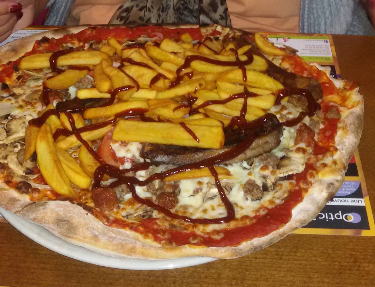 Pizza mit Fritten, Bratwurst, SpareRibs, Spiegelei und mehr: