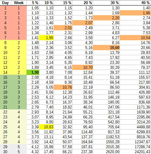 Hier mal eine kleine Übersicht, wie sich ein Unterschied im Zuwachs pro Tag auswirkt (Die Berechnung ist vereinfacht, konstanter Faktor). Die oberste Zeile zeigt den Anstieg pro Tag, die linke Spalte die Anzahl Tage und die Werte in der Tabelle sind der Multiplikator nach den Tagen.