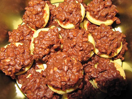Mit Marmelade (ich verwende Nutella) füllen, in zerlassene Fettglasur tauchen (mit nur einer Seite) und in Kokosflocken tupfen. Fertig ! Lecker !!!