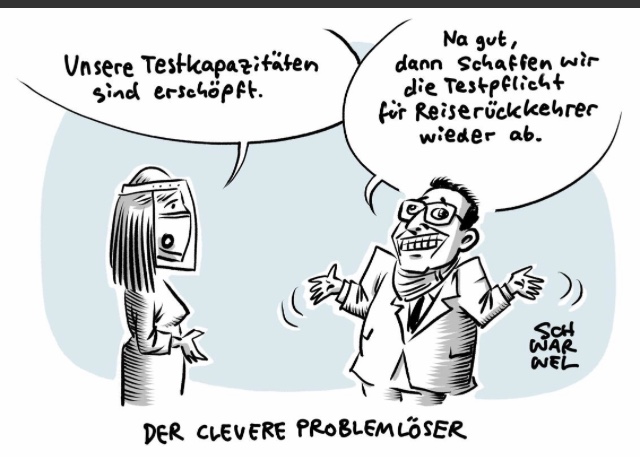 “spiegel.de, 24.08.2020” hat geschrieben: Wer aus einem Risikogebiet nach Deutschland reist, muss derzeit einen Corona-Test machen. Bald könnten die Pflichttests jedoch wieder abgeschafft werden. Stattdessen soll dann nur noch die Quarantänepflicht gelten. ... Das heißt: Die Betroffenen müssen sich wie bisher beim Gesundheitsamt melden und sich in Quarantäne begeben. Diese soll im Unterschied zur jetzigen Regelung erst dann verlassen werden dürfen, wenn mit einem frühestens fünf Tage nach der Einreise gemachten Test ein negatives Ergebnis vorgewiesen wird.