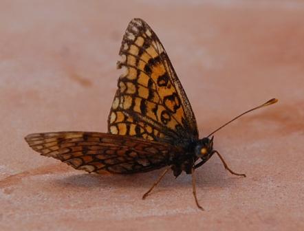 Dafür konnte ich den Scheckenfalter von allen Seiten fotografieren, da er in den Pool gefallen ist und sich nach seiner Rettung erst einmal erholen musste.